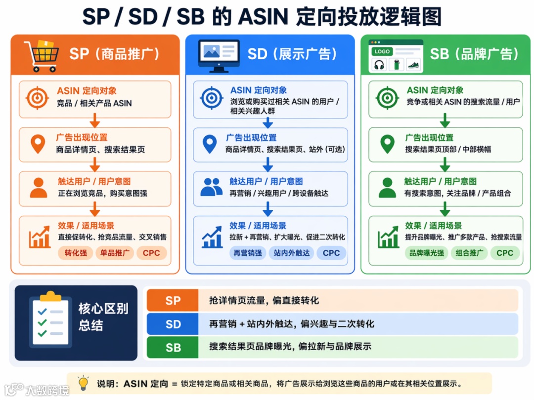 在进行ASIN定投的时候,我们通过SP/SD/SB都可以实现,不同的广告类型进行投放,会产品不同的效果,这三种投放方式最明显的差异是广告位的区别,不同的类型,对应不同的效果和场景,同时SD可以搭配品牌促销将流失的客户拉回来,下图大家仅个人观点,供参考,欢迎理性交流
