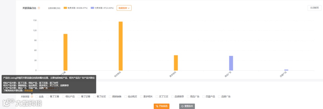 3.通过查询关联流量,找到对手AISN产生关联流量的入口,亚马逊的流量中在详情页面被“截胡”流量占比极高。通过分开反查自己ASIN与竞品ASIN,找到自己缺少的关联流量入口,这部分入口中存在部分流量为亚马逊推荐,导致无法通过广告实现投放,但是针对付费的部分,基本可以进行补充,缩小流量差距,这里需要说明的是这里的关联流量是出现在商品详情页面的关联位,并不是搜索AISN是出现在搜索结果页面的关联位,我们要把关联流量分为两类来看: