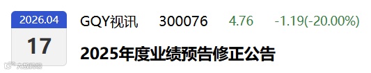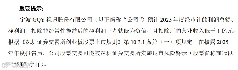 4月16日晚上,宁波GQY视讯股份有限公司(300076)的一则《2025年度业绩预告修正公告》、《关于公司股票交易可能被实施退市风险警示的风险提示公告》震惊了2万多名股东。因“2025年亏损+营收修正至1亿元以下”,公司股票在2025年年报公布后可能要被实施退市风险警示了(股票简称前冠以“*ST”字样)!