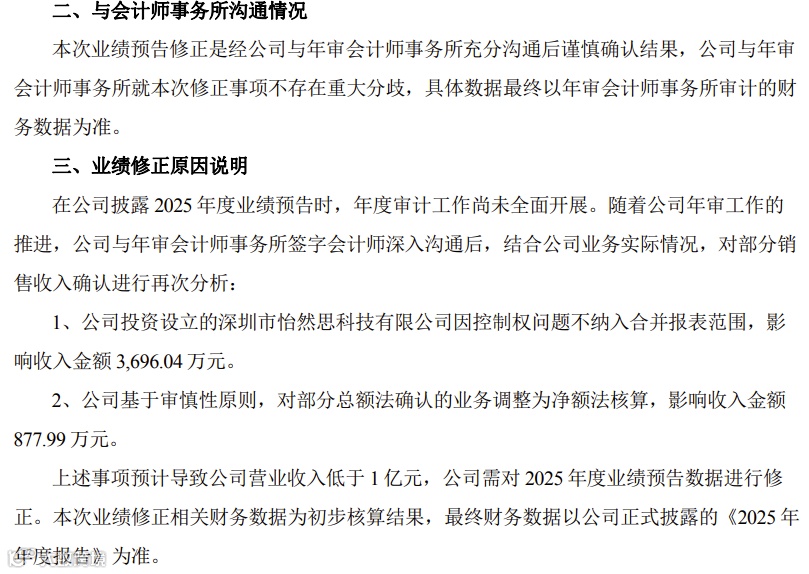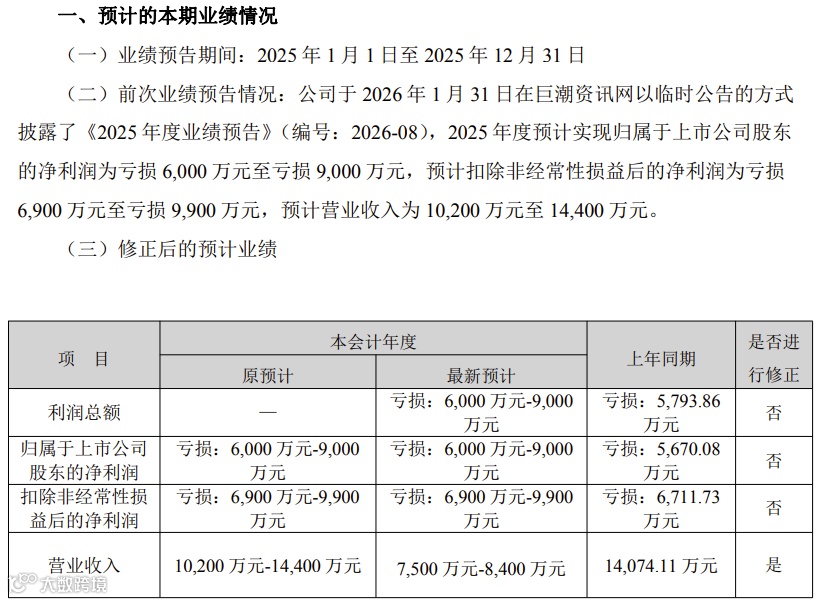 然而4月16日晚上发的《2025年度业绩预告修正公告》,在预计亏损金额不变外,把营收向下修正至7500万元-8400万元。根据《深圳证券交易所创业板股票上市规则》第 10.3.1 条第(一)项规定,上市公司出现“最近一个会计年度经审计的利润总额、净利润、扣除非经常性损益后的净利润三者孰低为负值,且扣除后的营业收入低于 1 亿元。”的情形,其股票交易将被实施退市风险警示。在披露 2025 年年度报告后,公司股票交易可能被深圳证券交易所实施退市风险警示。