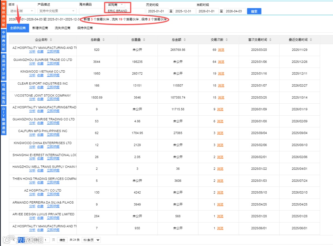 像这家美国的公司就有很多家的供应商,可以看到这家公司流失的供应商比较频繁,恰巧说明这家公司其实是会有较大意向考虑其他公司合作的,我们也可以尝试和他们商谈,流动性大同时说明他们可能对品质也有一定要求。