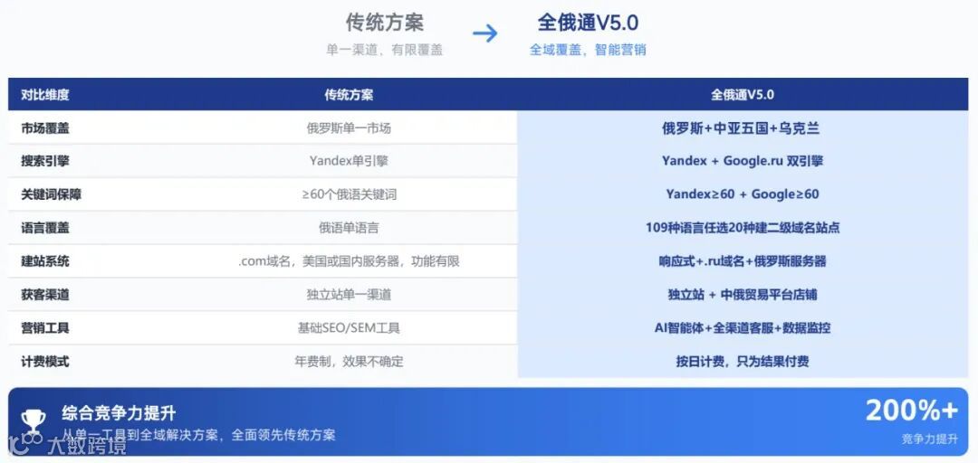 全俄通19年专注于为中国B2B企业出海提供搜索引擎营销一站式整合解决方案,以领先的搜索算法、人工智能、大数据、数字营销和社交营销技术已为5000+外贸企业提供了外贸独立站建设、Yandex出海营销服务、国外社交网络推广、AI大数据获客等服务。