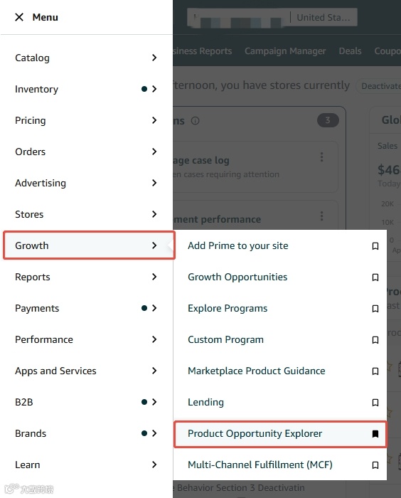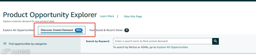 登录卖家平台,在左侧菜单栏点击 Growth→ 选择 Product Opportunity Explorer → 点击页面上方 Discover Unmet Demand 标签页。