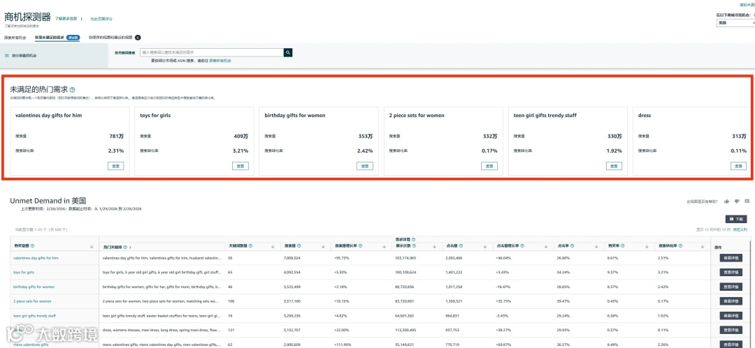这个功能的逻辑是,亚马逊通过分析平台数十亿真实的买家搜索、浏览、加购和购买行为,帮你找出一批搜索量高,但转化率低于基本标准的品类。