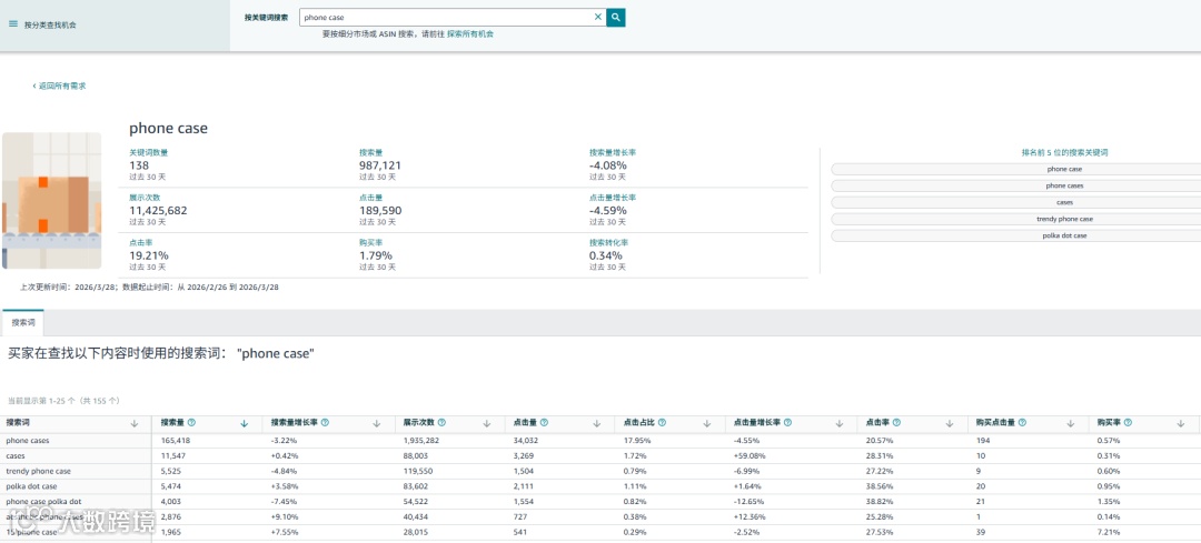 点击任意机会进入详情页。在这里,数据会细化到具体的搜索词。卖家可以看到该集群下排名前10的热门关键词、过去30天的搜索趋势、点击率、转化率等。
