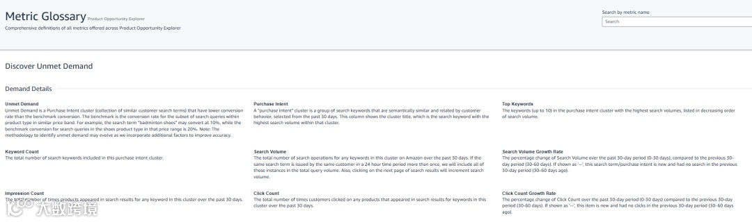 系统内置了详细的术语表,对未满足的需求、购买意图、搜索转化率等所有关键数据指标的定义和计算逻辑做了解释。数据背后的含义随查随懂,新卖家也能快速上手。