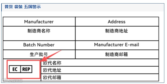 自欧盟 GPSR 法规实施后,欧洲站卖家均知晓:除特殊品类外,销往欧盟的产品必须配备欧盟授权代表(欧代),并在商品上粘贴欧代信息标签,其标识为EU REP。(如下图)
