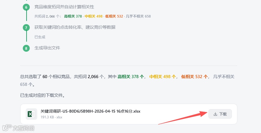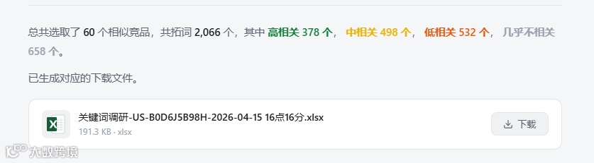 最后输出的关键词数量,不同相关度的关键词数量都是跟上面那个不一样的。所以他不是很机械的同类目同关键词,而是真正做到了具体产品具体分析