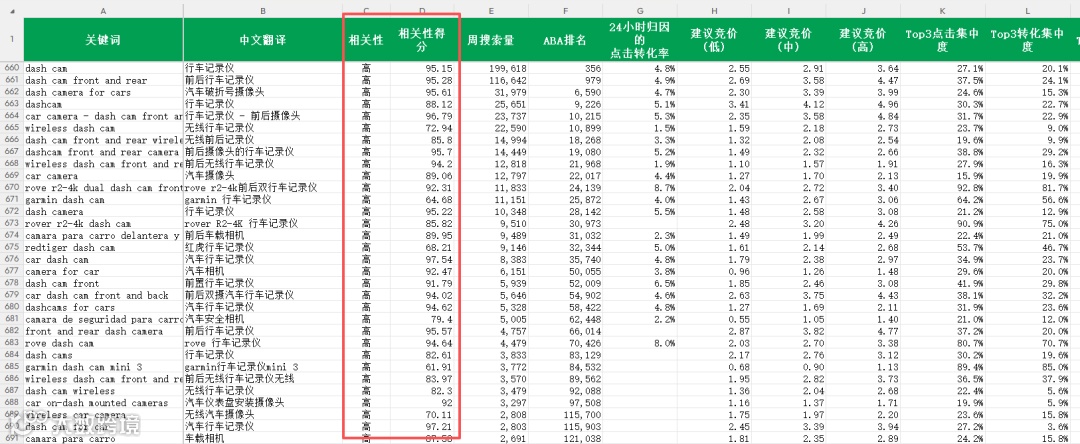 我们看一下下载好的关键词库,每个词都已经标记好了相关性,并且有具体的分数。默认是60%以上算是高相关,如果你觉得下载了词库之后还想要再精准一点,那你按照相关性得分再筛选也可以