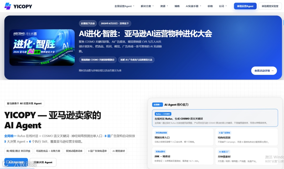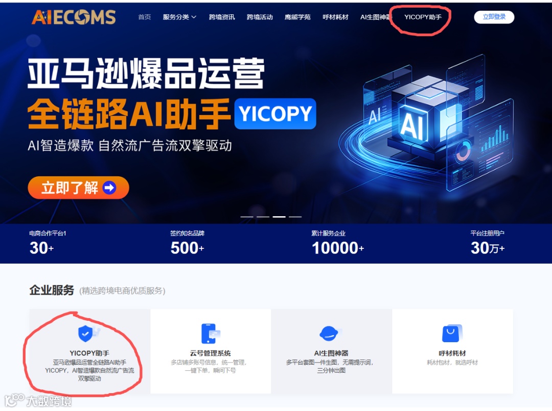 2,如果想要大量获取到COSMO的关键词,目前亚马逊行业唯一的渠道就是YICOPY AI,也可以通过AIECOMS.COM首页,找到YICOPY助手点击即可直接进入这个AI工具的网站。进入这个AI工具网站后,只要按照操作指引点击几个下一步,就可以拿到大量的亚马逊搜索词库和COSMO词库;如果再进行深度的操作,就可以把数万个关键词提炼出几百个有效词。