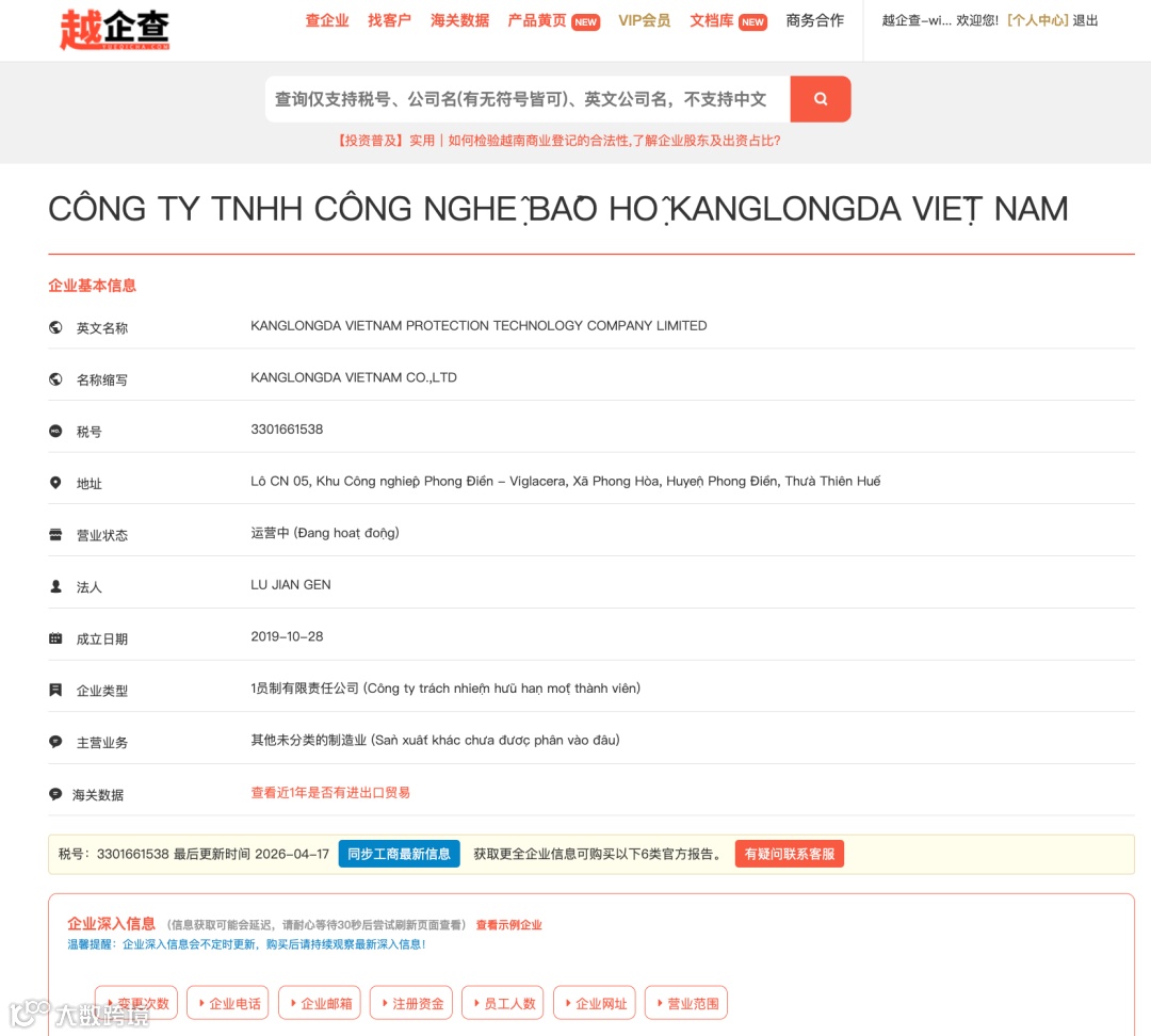 其中,康隆达(越南)安防科技有限公司位于顺化市丰田工业区,隶属于香港企业Kanglongda International Holdings Limited。公司成立于2019年,截至2026年4月,注册资本已超过8070亿越南盾,由中国籍人士Lu Jian Gen担任总经理兼法定代表人。
