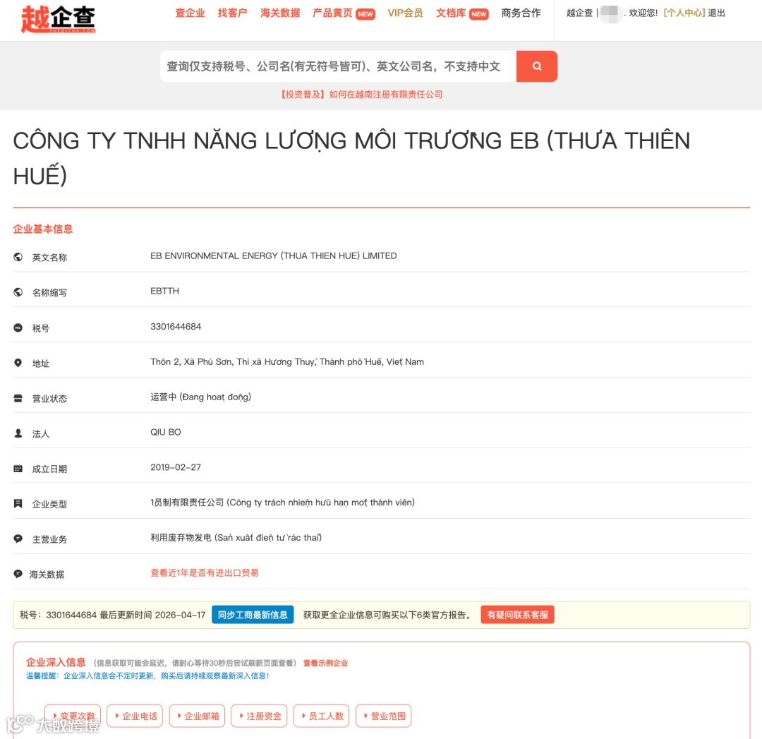 除了康隆达,此次同样被纳入检查范围的,还有EB环境能源有限公司。该公司隶属于中国光大环境有限公司,是顺化富山垃圾发电厂项目的投资方,总投资约1.7万亿越南盾。