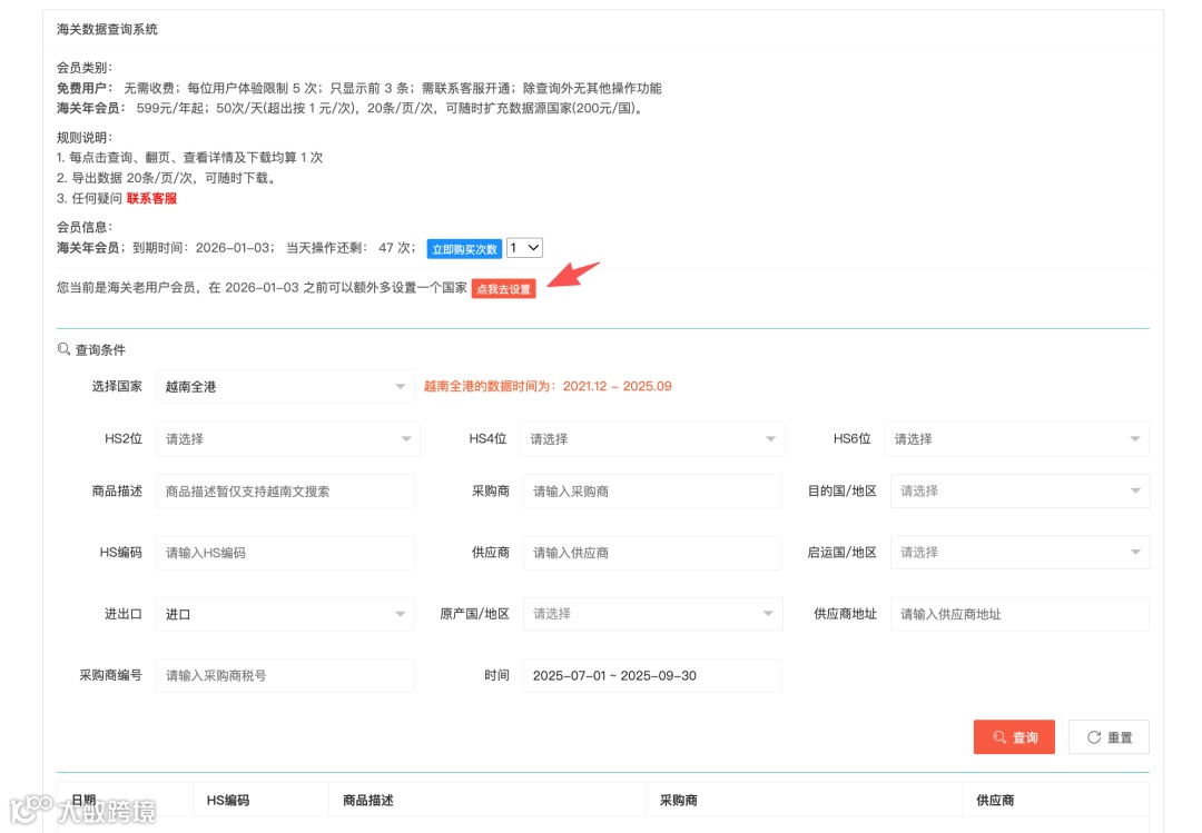 *对于现有海关数据会员,在原有权益上赠送多一个国家/地区数据源,可在海关数据页面操作,如下图: