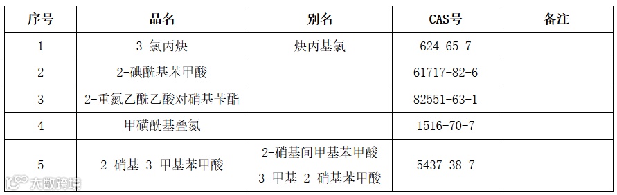 应急管理部会同工业和信息化部、公安部等九部门联合公告,将3-氯丙炔、2-碘酰基苯甲酸、2-重氮乙酰乙酸对硝基苄酯、甲磺酰基叠氮、2-硝基-3-甲基苯甲酸等5种化学品纳入《危险化学品目录(2015版)》,并配套完善《危险化学品分类信息表》。公告自发布之日起施行。
