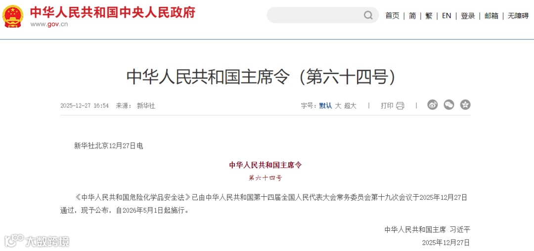 《中华人民共和国危险化学品安全法》将于2026年5月1日正式施行。新法明确:
