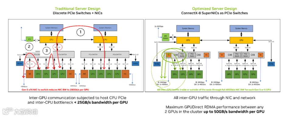 传统1机8卡PCIe GPU服务器普遍采用以CPU为根节点、PCIe Switch向下连接GPU的树形拓扑。这种架构在通用计算时代较为成熟,但在大模型训练场景下,其结构性性能瓶颈日益突出:GPU间通信往往需要经过PCIe Switch,跨Socket路径还可能受到主机链路约束,导致时延升高、带宽利用率下降,难以满足All-Reduce、Reduce-Scatter、All-to-All等高频集合通信对低时延和高吞吐的要求。因此ConnectX-8将PCIe Gen6交换能力与高速网络能力整合到单一器件中,可替代传统离散PCIe Switch,既优化GPU到GPU、GPU到NIC的数据路径,也降低系统复杂度、功耗和总体拥有成本。