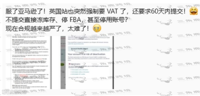 然后现在很多卖家反馈的是,亚马逊给补交通知只有60天,但正常VAT注册却要等3个月左右才能下来,这个时间差,足以让一个店铺陷入瘫痪。