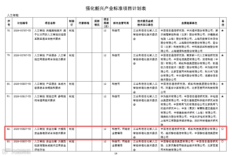 4月9日,工业和信息化部办公厅印发了《工业和信息化部2026年第一批行业标准制修订和外文版项目计划》。其中,由中国信息通信研究院(以下简称“中国信通院”)牵头组织实施的《人工智能 安全治理 大模型安全基准测试总体技术要求》行业标准项目正式立项。