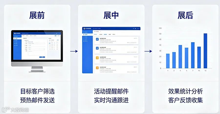 展前的核心是精准预热。把联系人按来源、产品兴趣、区域分类,用不同语言的个性化邀请函分批发出,效果远好于一封统一模板。倒计时提醒设置成序列,往届展会亮点回顾或行业报告作为钩子,给收件人一个打开邮件的理由。