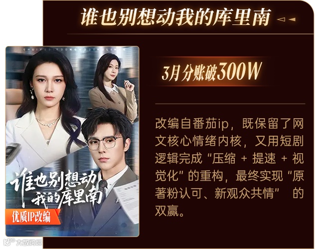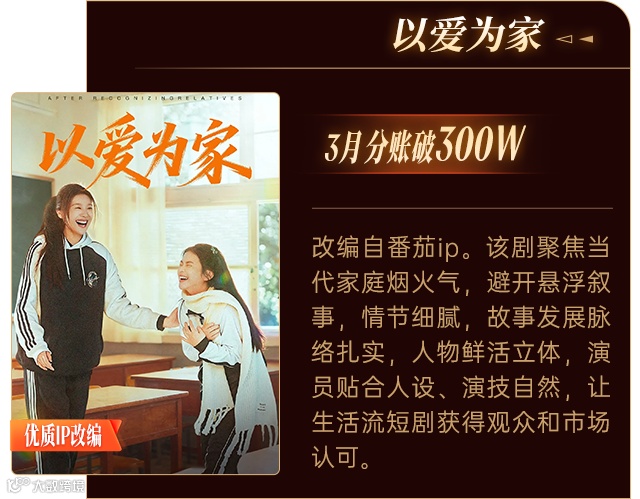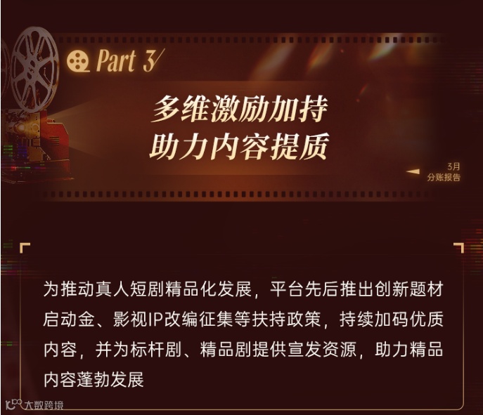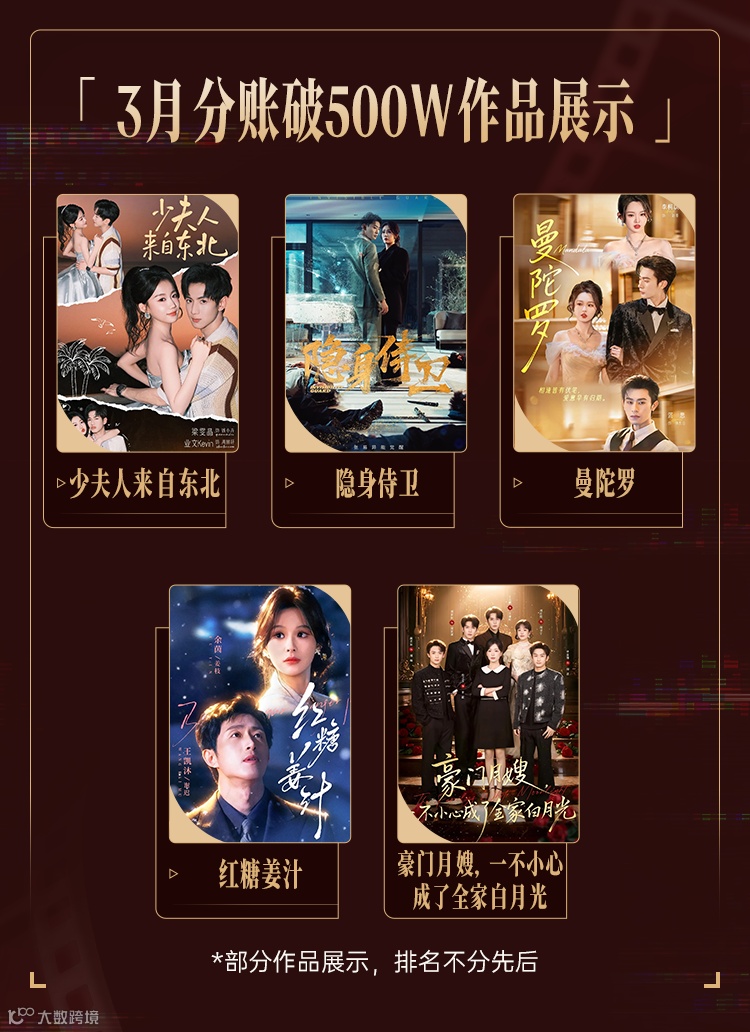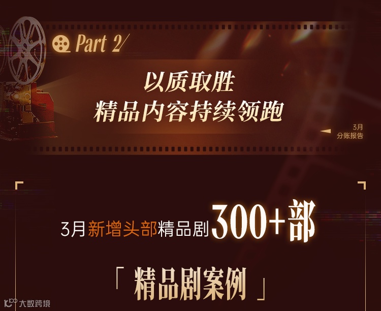 根据公布的数据,3月平台新增头部精品剧超300部。单月分账方面: