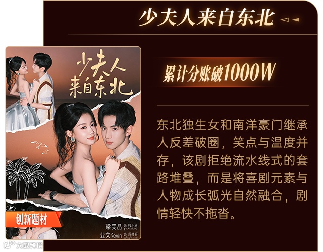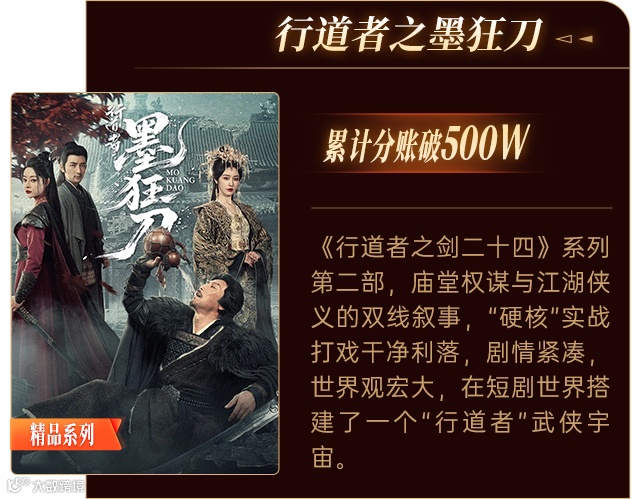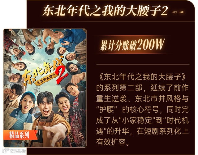 累计分账方面,《少夫人来自东北》累计分账已超过1000万元,《行道者之墨狂刀》《昼以继夜》累计分账均超过500万元,《东北年代之我的大腰子2》累计分账超过200万元。
