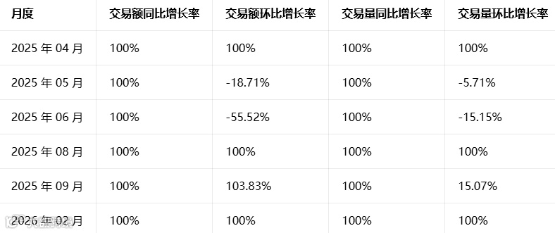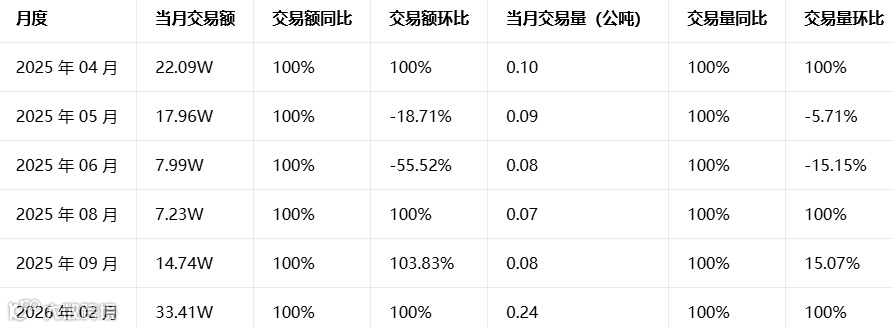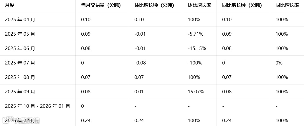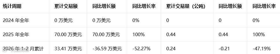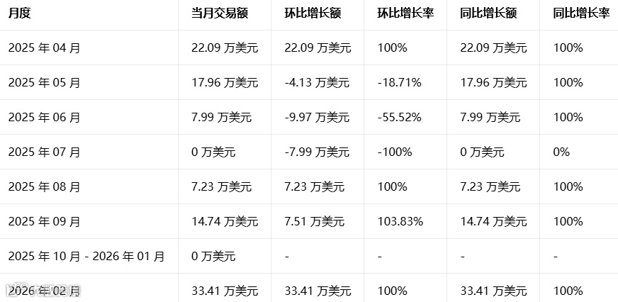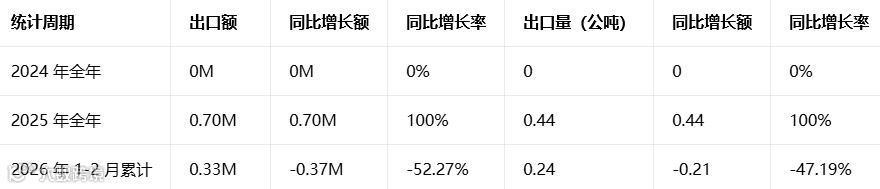 2026 年 2 月恢复出口,单月出口额 33.41 万美元、出口量 0.24 公吨,创下统计周期内单月出口峰值,环比、同比均实现 100% 增长。
