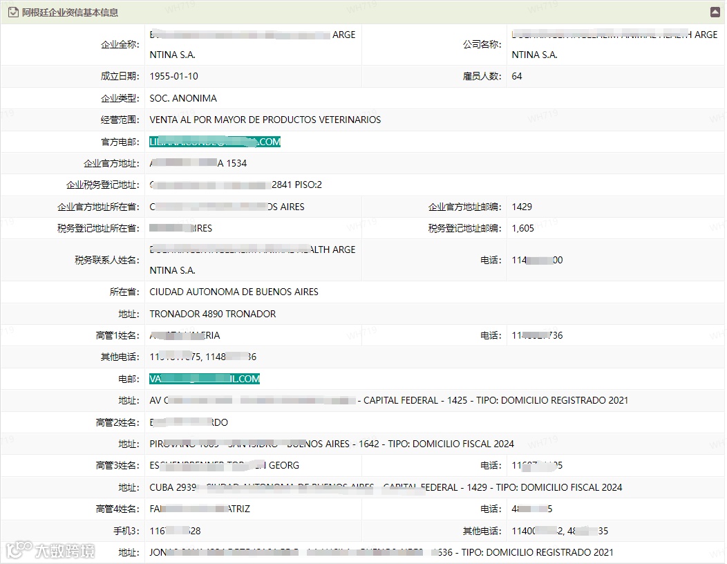 阿根廷企业资信信息:企业全称,官方邮箱,企业地址,税务登记地址,高管1姓名,电话,邮箱,高管2姓名电话,高管3姓名,电话,高管4姓名,电话,地址。