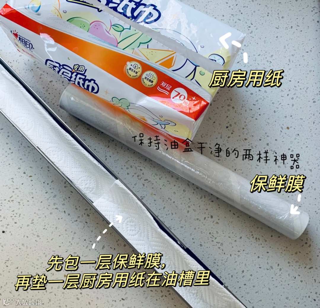 赵阿姨说她早就不遭这个罪了,方法特别简单。先把油槽彻底洗干净,擦干,铺一层保鲜膜裹好,然后再铺一层厨房纸在上面。就这么搞定了!