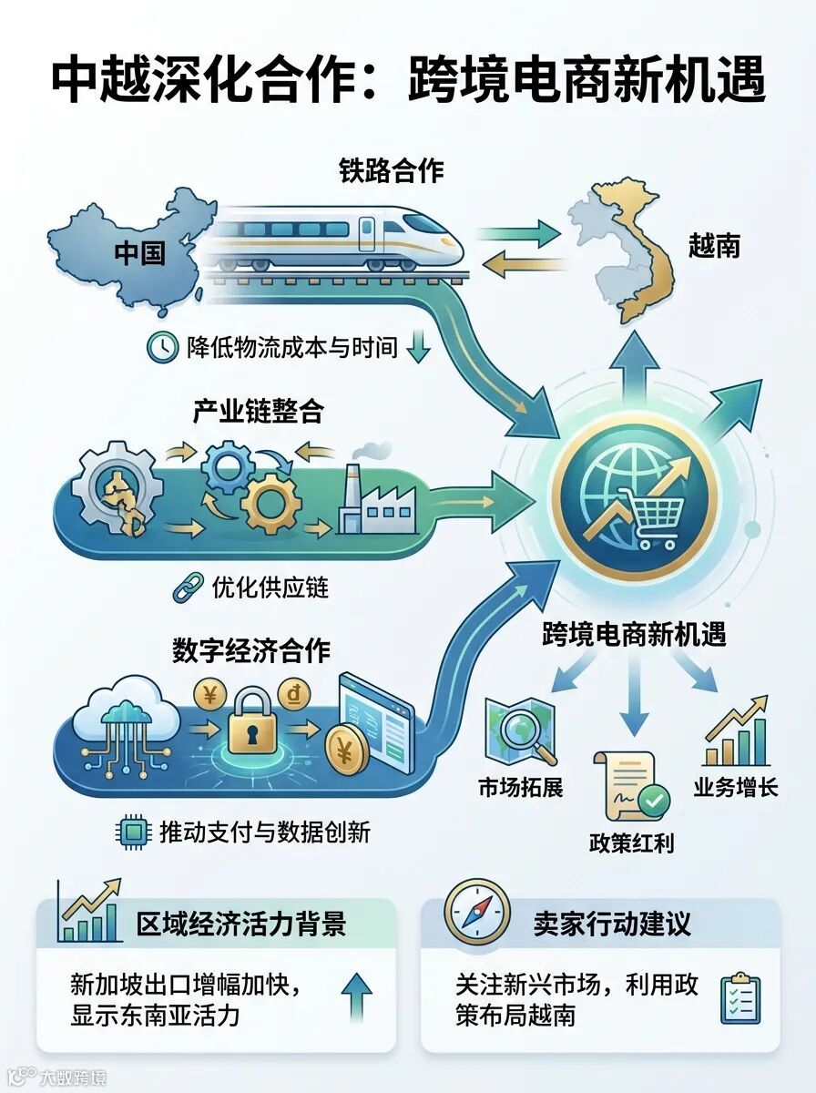 简评:地缘合作打开新窗口🌏,卖家可借势优化物流和供应链。建议关注越南市场增长潜力,探索数字支付等创新服务。但需平衡机遇与风险,如当地政策变化,建议小步快跑、逐步扩张。
