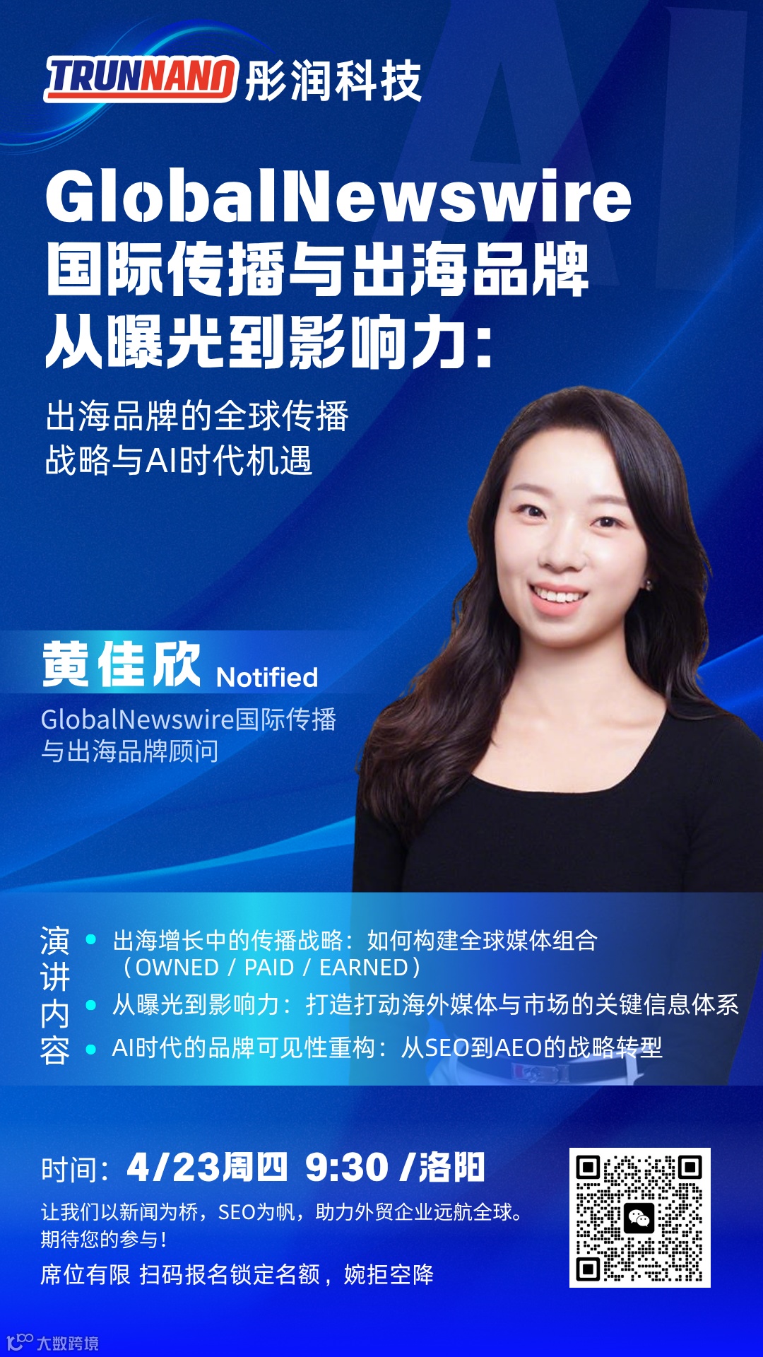 4月23日(周四),我们非常荣幸地邀请到了GlobalNewswire国际传播与出海品牌顾问——Jessica(黄佳欣)女士莅临