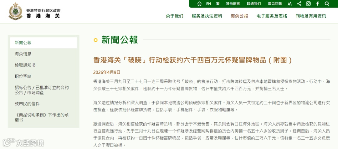 海关发布公告,代号为「破晓」的专项执法行动,在三周内密集开展,重点打击跨境转运及本地供应冒牌货物的违法行为。执法人员通过精准情报分析,锁定新界区域约20家物流公司,开展突击搜查,最终侦破37宗仿牌相关案件,查获疑似仿牌商品约11万件,涵盖手表、箱包、电子配件、香水化妆品等多个热门品类。