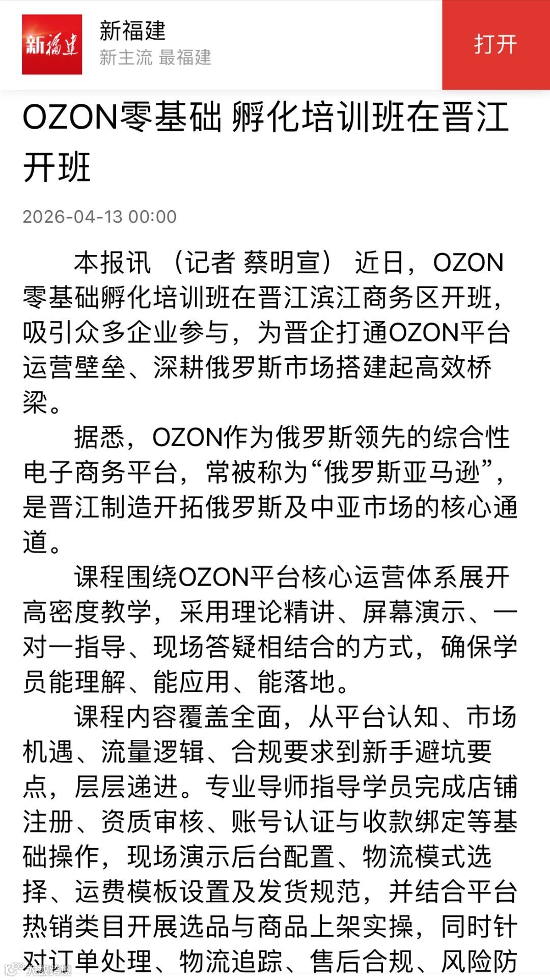 晋江跨境电商公共服务中心OZON零基础孵化培训班活动获《晋江经济报》专题报道:https://share.fjdaily.com/displayTemplate/news/newsDetail/526240.html?isDigital=true&isShare=true