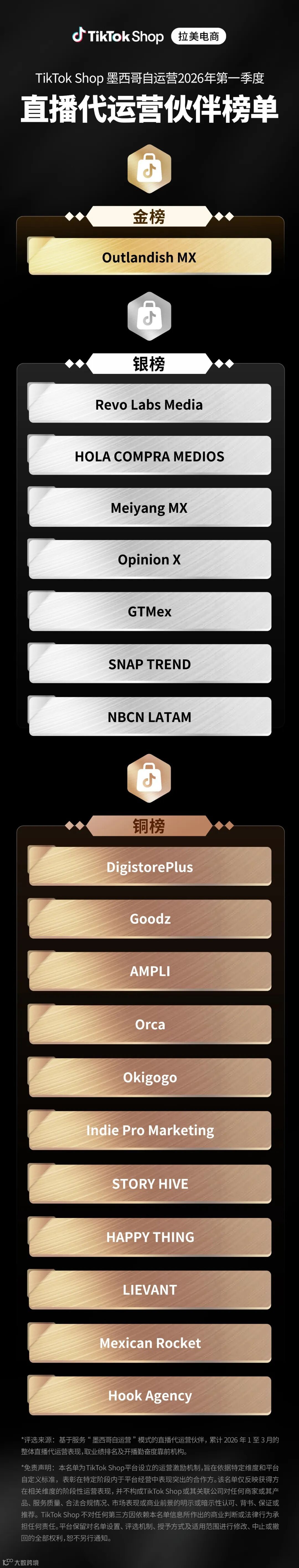 TikTok Shop拉美电商2026年第一季度,墨西哥直播电商热度持续攀升。TikTok Shop墨西哥自运营正式发布首期直播代运营伙伴榜单。
