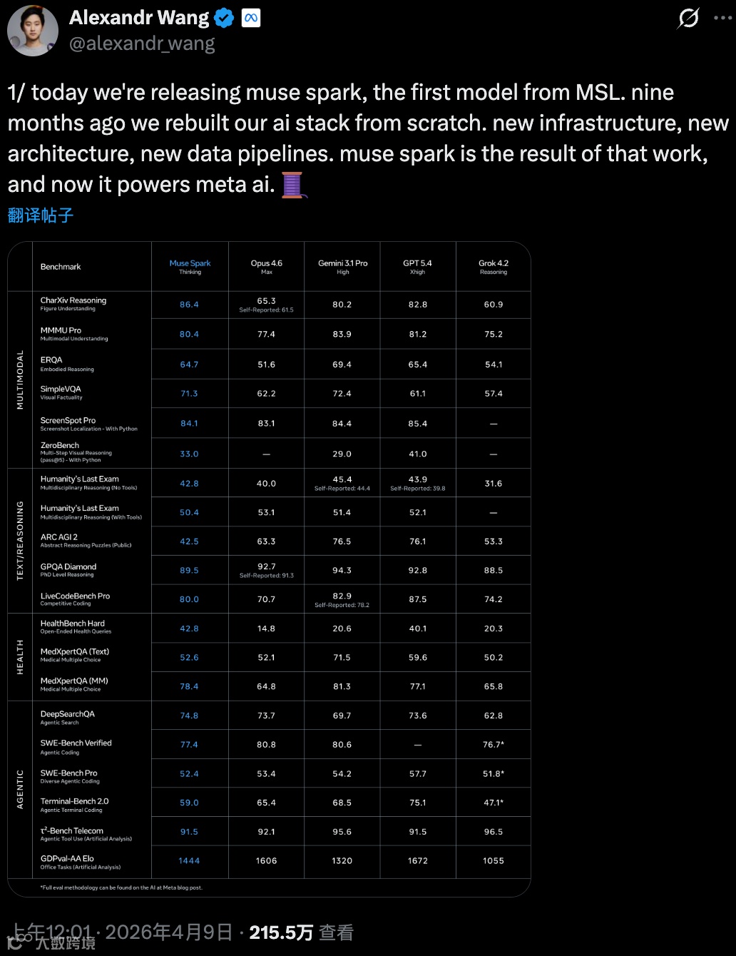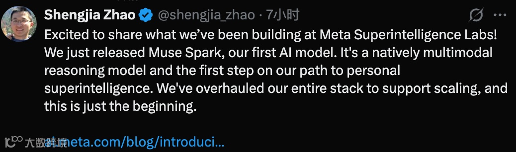 Wang在社交平台X上表示,Muse Spark是Meta迄今发布的最强模型,具备工具调用、视觉思维链及多智能体协同能力,将作为全新Muse模型家族的起点。多位从OpenAI跳槽至Meta的核心研究人员已开始投入新模型的应用。