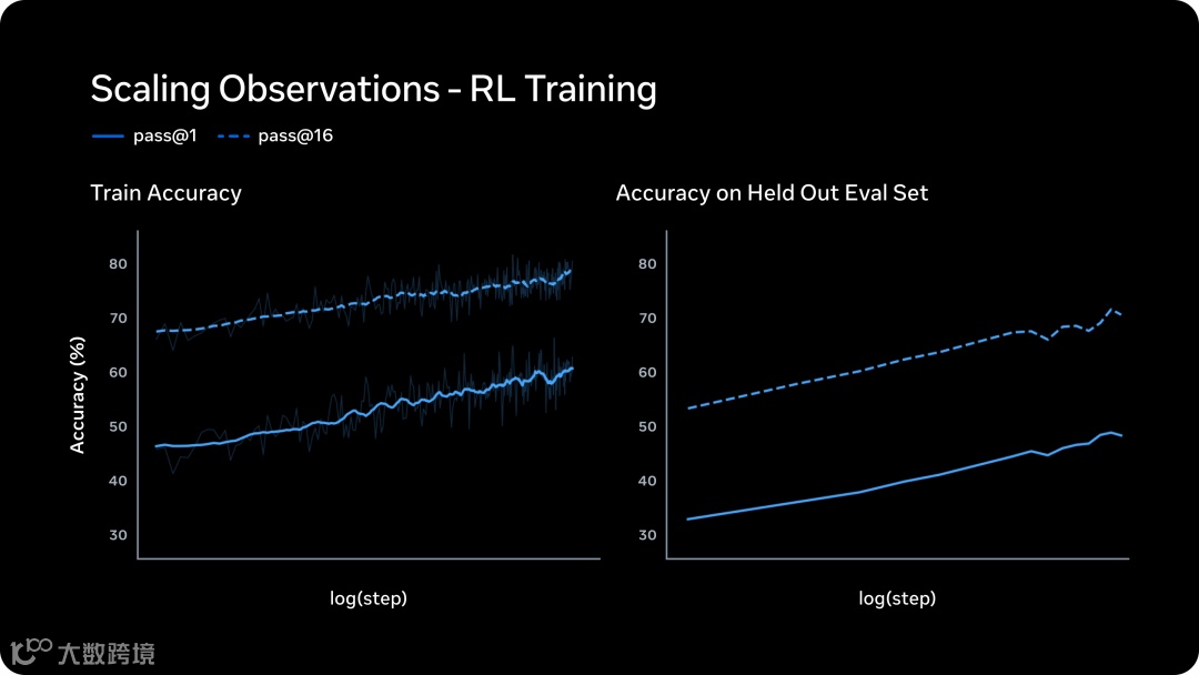 新体系下强化学习表现稳定可预测。训练数据显示,随着计算量增加,pass@1和pass@16指标呈现对数线性增长,证明模型在提升可靠性的同时保持推理多样性。测试集准确率持续提升,验证了良好的泛化能力。