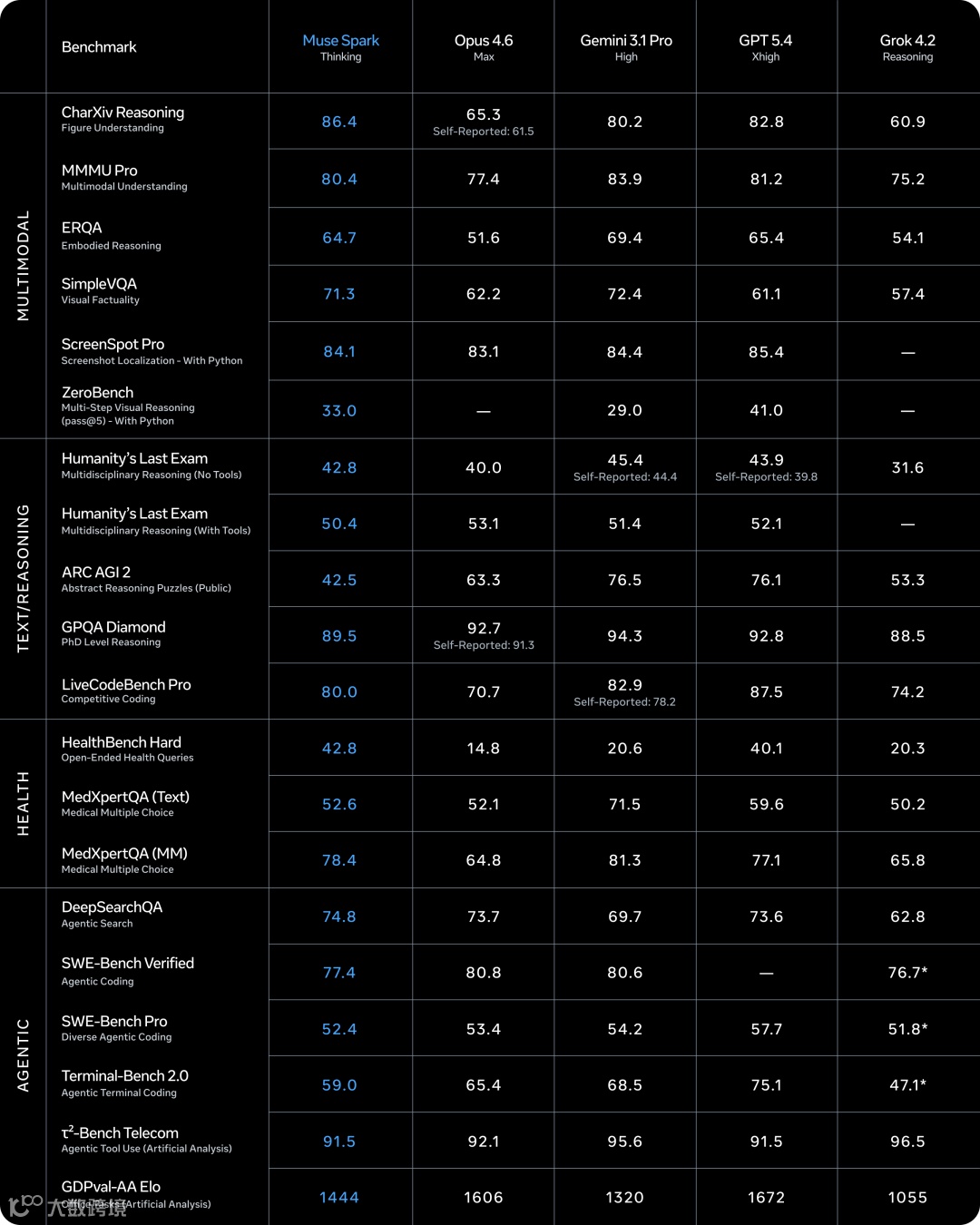 Muse Spark在多模态感知、推理、医疗任务及各类agent任务上表现卓越。Meta同时推出Contemplating(深度思考)模式,可调度多个agent并行推理,在推理能力上达到行业领先水平。