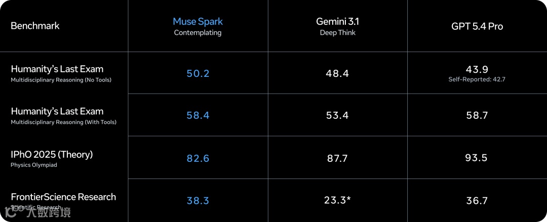 在关键评测中,启用Contemplating模式的Muse Spark在Humanity's Last Exam测试中达到58%,在FrontierScience Research测试中达到38%。该深度思考模式将逐步在meta.ai中上线。