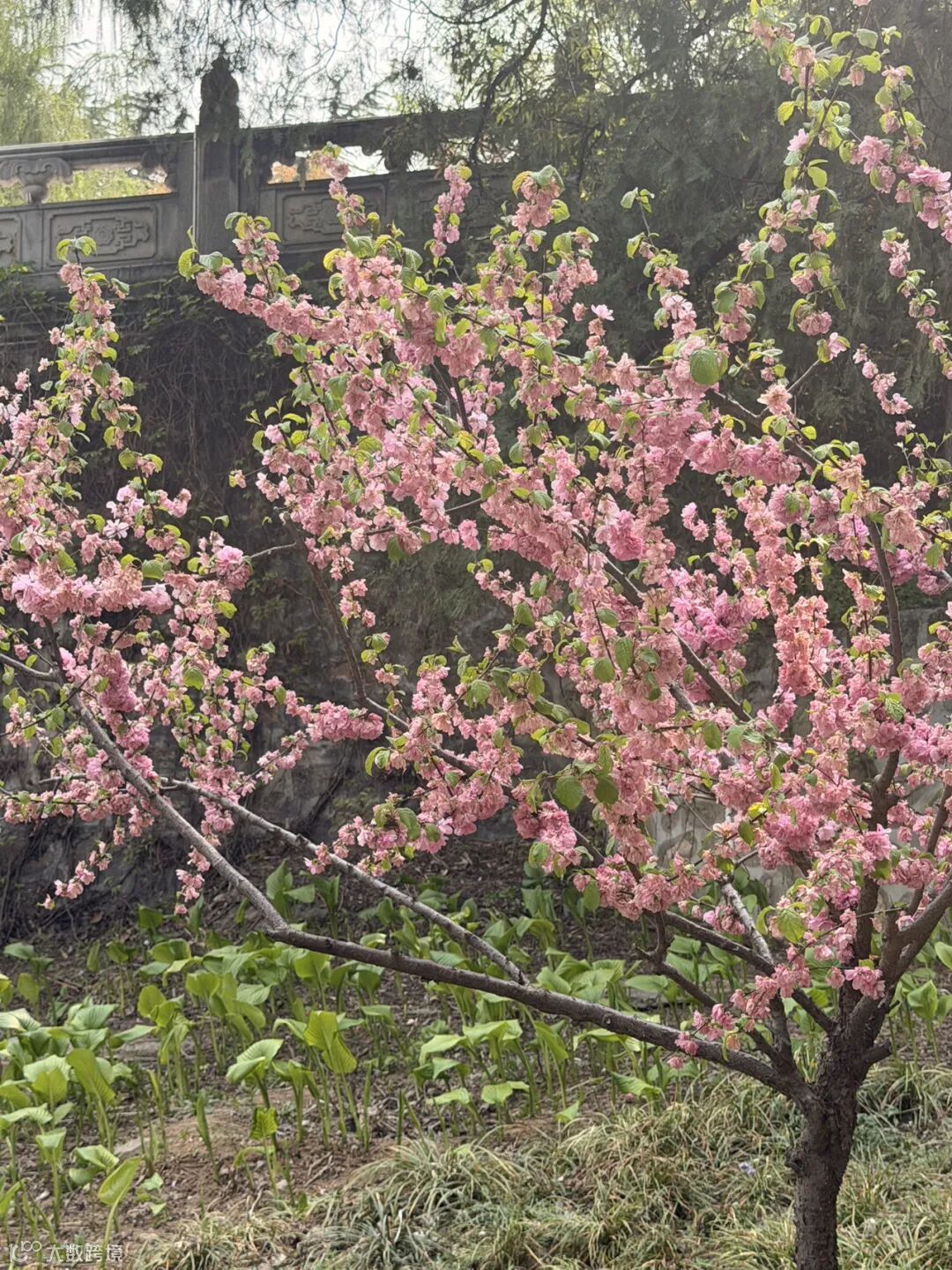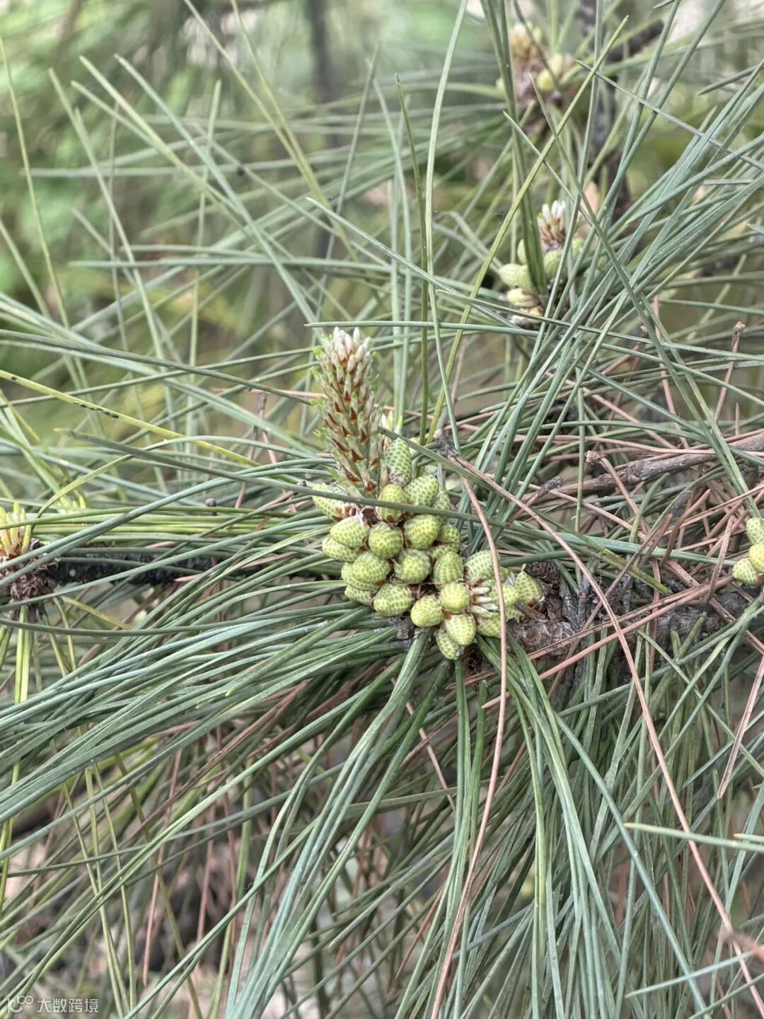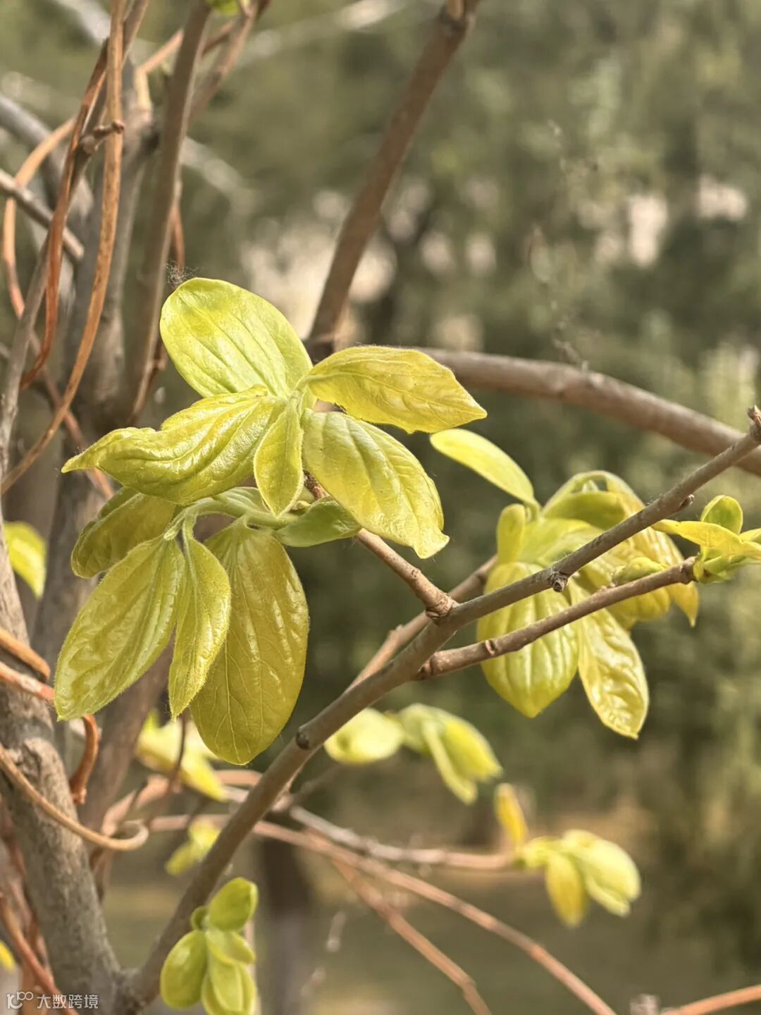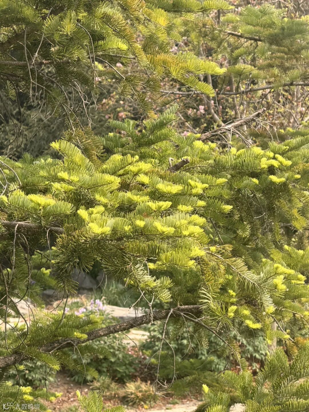 柿子树嫩芽从铁灰色枝干间探出,呈淡雅鹅黄;银杏新叶边缘微蜷,形似古籍中未展平的页角;冷杉嫩芽如淡绿玉笔尖,在墨绿针叶间悄然舒展;油松枝梢缀满淡黄雄花与青绿雌蕊,宛如自然写就的春之诗篇。