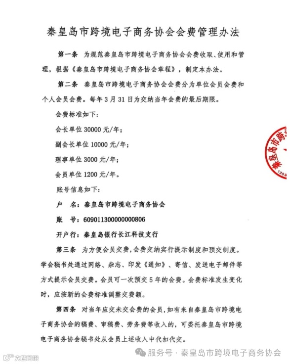 会费是支持协会运作的基础。感谢贵单位历年来鼎力支持!现依据《秦皇岛市跨境电子商务协会章程》,就2026年度会费缴纳事宜通知如下: