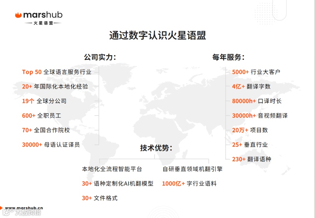 作为全球领先的数智化语言服务提供商,火星语盟核心业务覆盖多语种笔译、口译、本地化、影视译制等全流程语言服务,并提供AI智译、AI同传、AIGC等翻译技术解决方案,广泛应用于影视、游戏、ICT、生命科学、金融等领域。