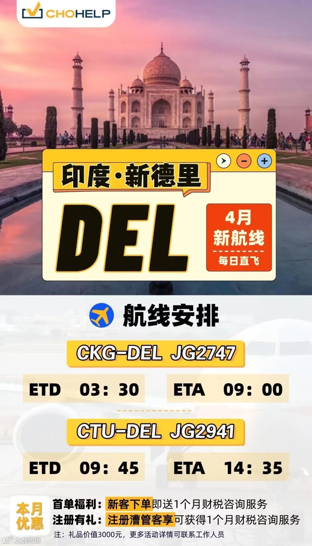 重庆CKG→新德里DEL(03:30起飞)、成都CTU→新德里DEL(09:45起飞)每日直飞无中转。一手航司合作资源确保旺季优先排舱,拒绝临时加价与甩舱。