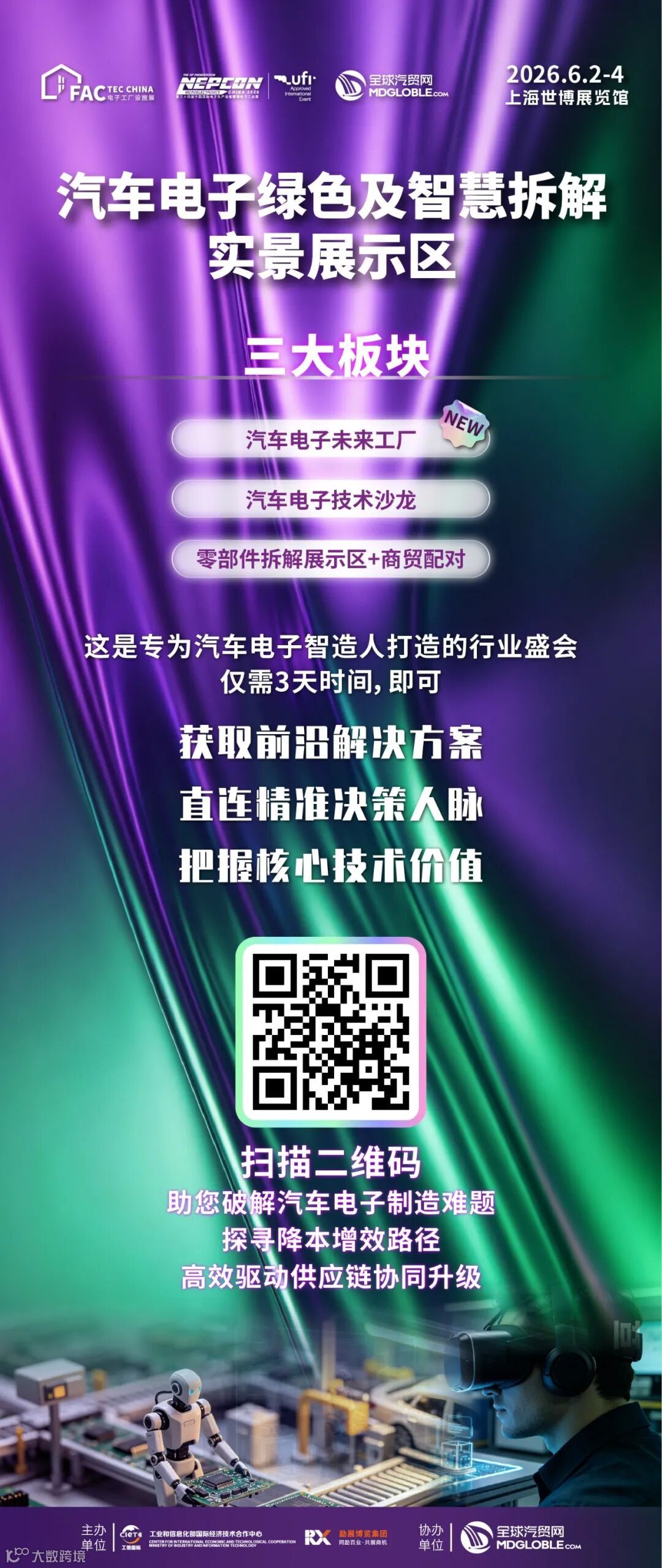 NEPCON China 2026中国国际电子生产设备暨微电子工业展将全面升级,同期举办S-FACTORY EXPO智能工厂及自动化技术展与FAC TEC电子工厂设施展。三大展会整合"电子生产设备"、"设备配件/耗材"及"端到端工厂设施"三大板块,打造汽车产业一站式商贸采购平台。全球汽贸网联合呈现"汽车电子绿色及智慧拆解实景展示区",三天掌握汽车电子全产业链机遇,助力技术展示、供应链协同与智造升级。