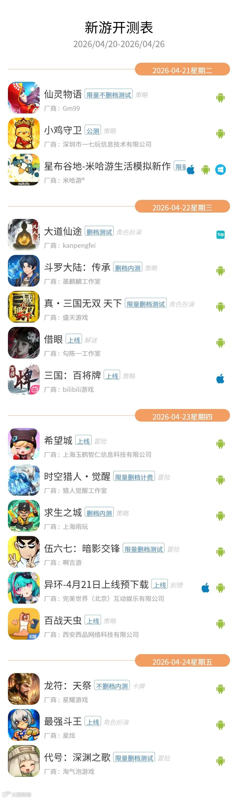 GameRes游资网统计了2026年4月20日—2026年4月26日的最新手游开测信息,共有17款游戏开测。以下是开测信息: