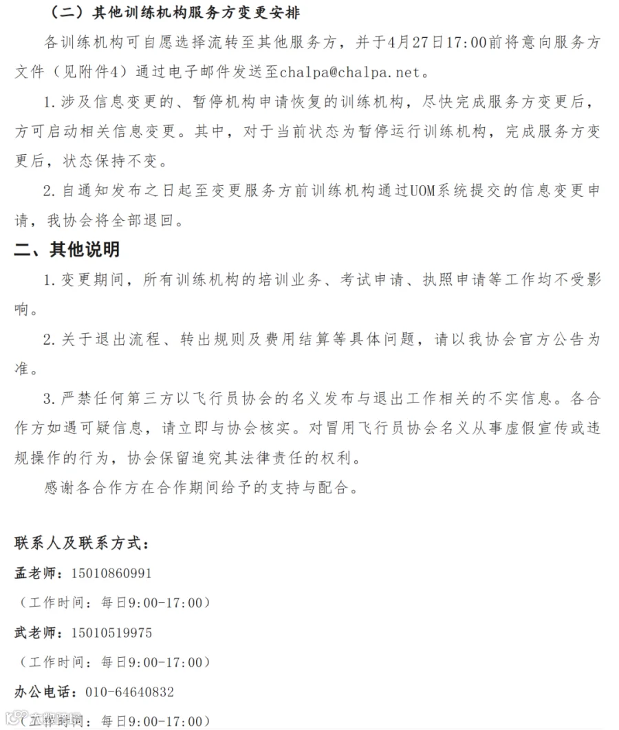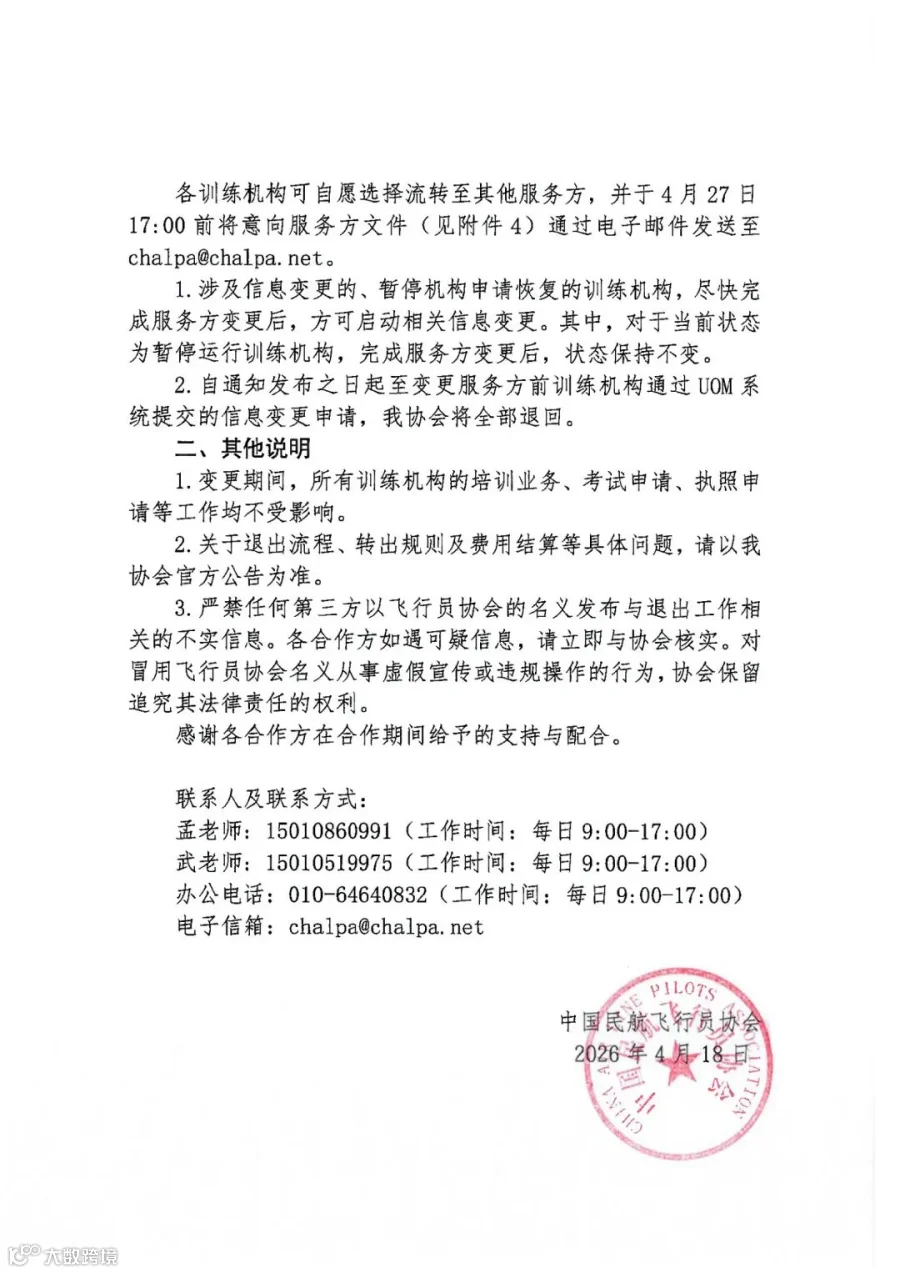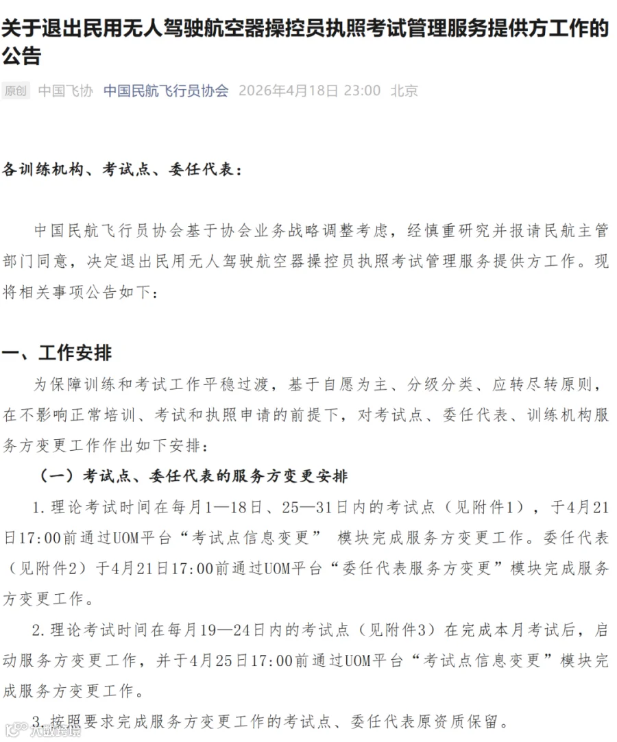 中国民航飞行员协会昨日发布公告,正式退出民用无人驾驶航空器操控员执照考试管理服务提供方工作。此前通过该协会申请资质的无人机训练机构可自愿选择流转至其他服务方,需于4月27日17:00前将意向服务方文件发送至电子邮箱 chalpa@chalpa.net。