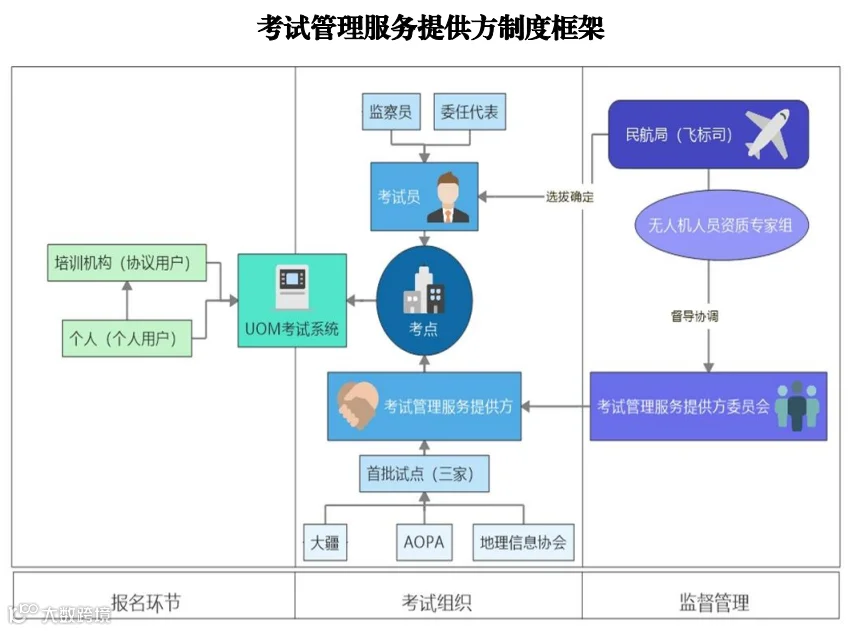 2021年底,民航局飞行标准司发布《民用无人机操控员执照考试管理服务提供方制度实施办法》,自2022年1月1日起施行。该办法明确飞标司督导成立服务方委员会,负责考试组织与实施工作。委员会由服务方代表及民航局无人机人员资质专家组成员组成,并设秘书处处理日常事务。