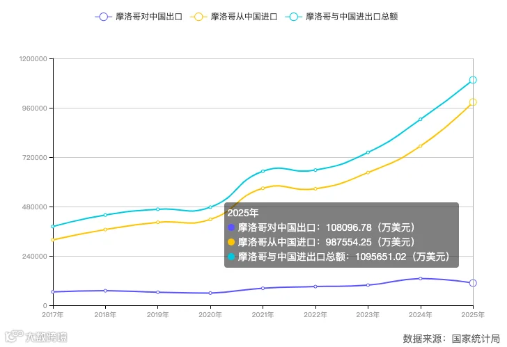 贸易差额: 2025年中国对摩贸易顺差为88亿美元。摩洛哥贸易逆差状态持续,但高科技产品进口的增长表明其工业升级正在推进。