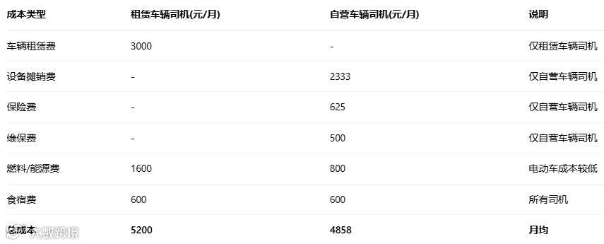 成本构成方面,南京网约车司机面临多重经济压力。对于租赁车辆的司机,月均成本约5200元(租赁费3000元/月+燃料费1600元/月+食宿费600元/月),日均成本约173元。对于自营车辆的司机,月均成本约4858元(设备摊销费2333元/月+保险费625元/月+维保费500元/月+燃料费800元/月+食宿费600元/月),日均成本约162元。