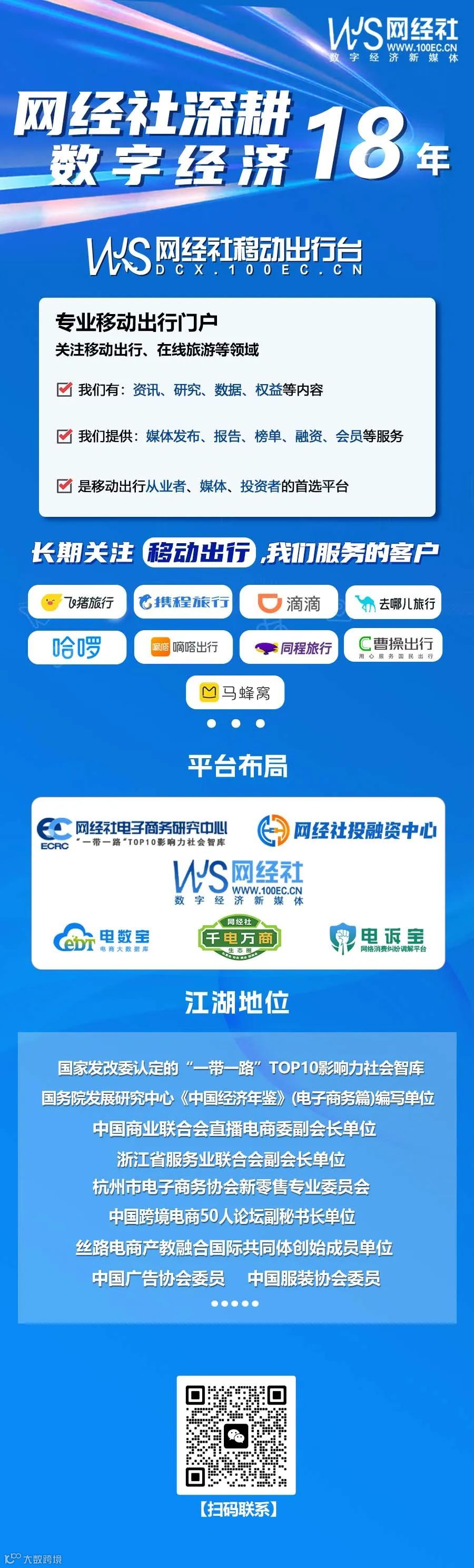网经社移动出行台(DCX.100EC.CN)是专业移动出行门户,重点关注在线旅游、酒店民宿、网约车、共享单车、共享汽车、顺风车、代驾、等业态。提供媒体发布、报告榜单、融资、会员等服务,是移动出行从业者、媒体、投资者、用户的首选平台。