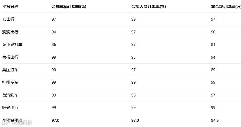 这些自律措施与政府监管相结合,有效提升了南京网约车行业的整体合规水平。2025年一季度,南京市网约车市场全平台合规车辆订单率97%,合规人员订单率96%,双合规订单率94%。到二季度,双合规订单率进一步提升至94.5%。但在具体平台中,分化明显:头部平台如T3出行、神州专车等双合规率超过99%,而花小猪打车(81%)、美团打车(89%)、妥妥E行(81%)等平台则低于90%。