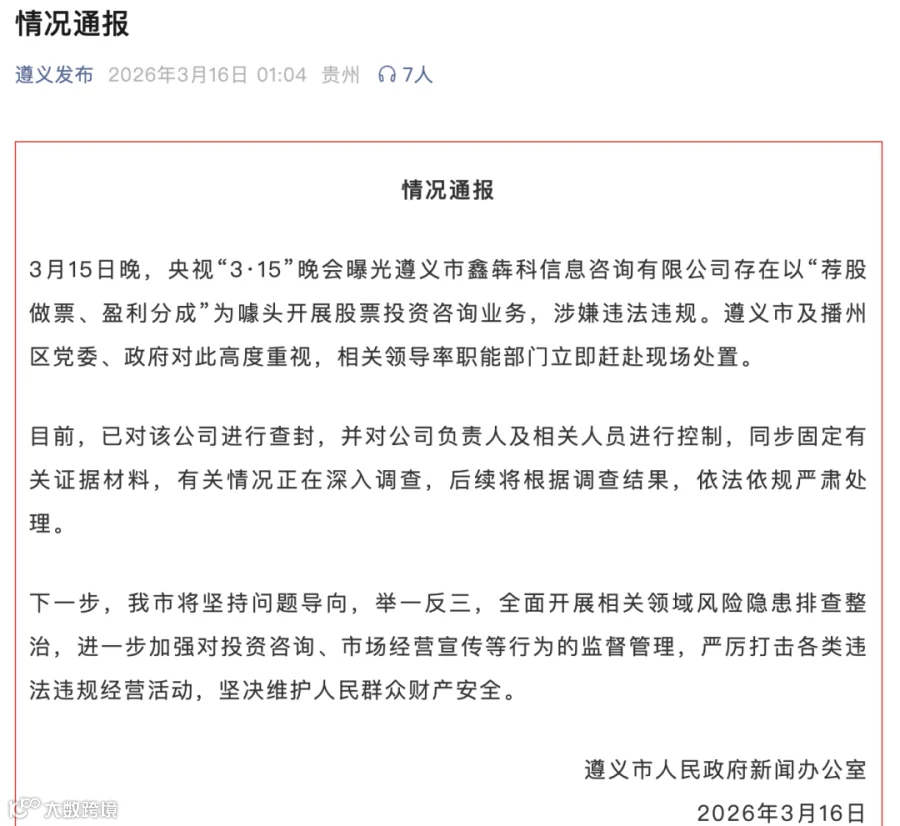 3月16日凌晨,据贵州遵义市人民政府新闻办公室通报,3月15日晚,央视“3·15”晚会曝光遵义市鑫犇科信息咨询有限公司存在以“荐股做票、盈利分成”为噱头开展股票投资咨询业务,涉嫌违法违规。遵义市及播州区党委、政府对此高度重视,相关领导率职能部门立即赶赴现场处置。